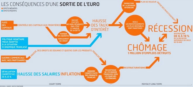 Σε δημοσίευμά της η εφημερίδα Les Echos ανέφερε μεταξυ άλλων πως «η έξοδος από το ευρώ, μια εκδοχή που ποτέ μέχρι την κατάρρευση της Ελλάδας δεν παρουσιάστηκε στα σοβαρά από κανέναν, έχει εισέλθει πλέον στη σφαίρα του πιθανού». H οικονομική εφημερίδα σχολιάζοντας τις προτάσεις του «Εθνικού Μετώπου» για εθελούσια αποχώρηση της Γαλλίας από το ευρώ παρέθεσε και ένα «αποκαλυπτικό» σενάριο το οποίο εκπονήθηκε από το ινστιτούτο Montaigne και εστίαζε στις επιπτώσεις για τη γαλλική οικονομία από την επιστροφή στο φράγκο.